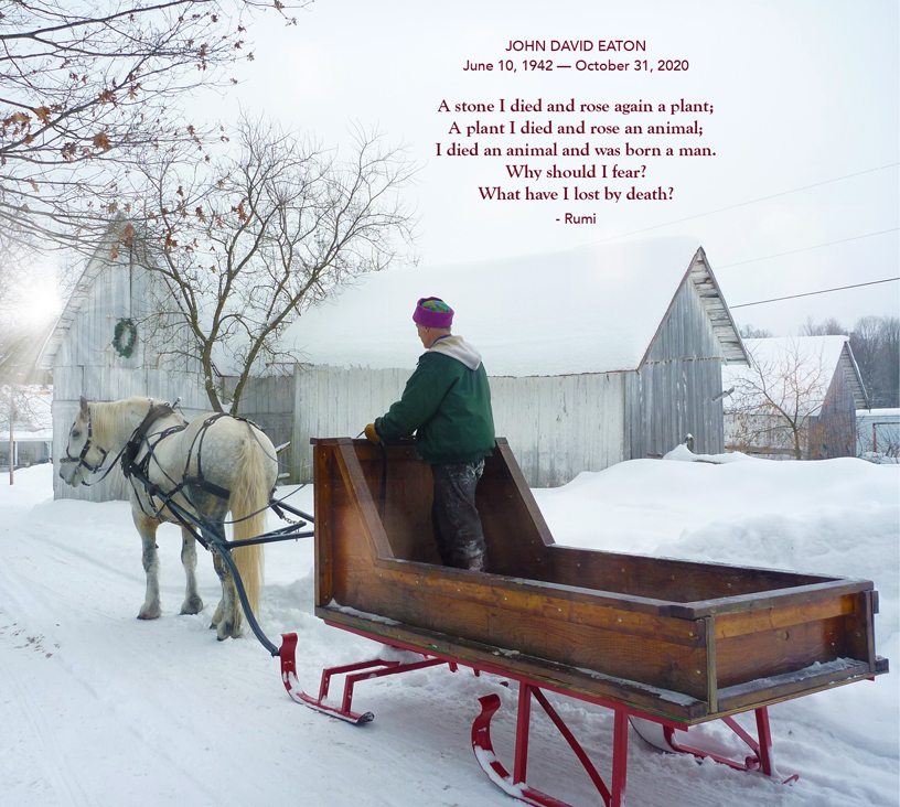 In the late sixties, John Eaton moved to Rupert, Quebec, renewing his connection to the Gatineau Hills and pursue his vocation as an artist for many years. In 2015, with the help of his partner, he started to work daily on his biography and cataloguing his life’s work. His sudden death by a heart attack, while riding his mountain bike with his horse Goya on his land came to a shock to everyone that loved him. His spirit now rests peacefully at home, at the farm, surrounded by all the beauty that animated and inspired him during his entire lifetime. His legacy will echo in the Gatineau Hills eternally.